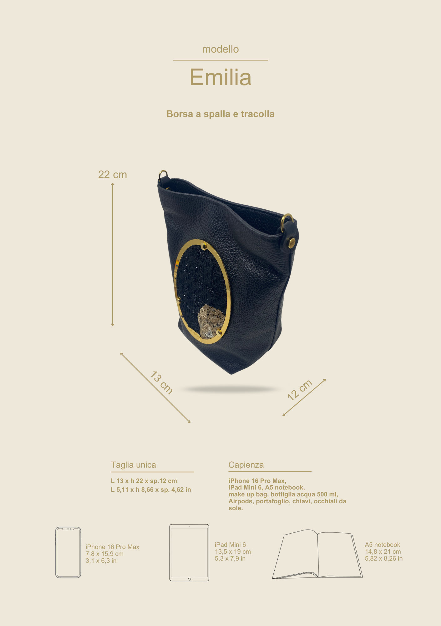 - Capienza: studiata per contenere iPhone 16 Pro Max, iPad Mini 6, taccuino A5, make up bag, bottiglia d’acqua 500 ml, AirPods, portafoglio, chiavi, occhiali da sole