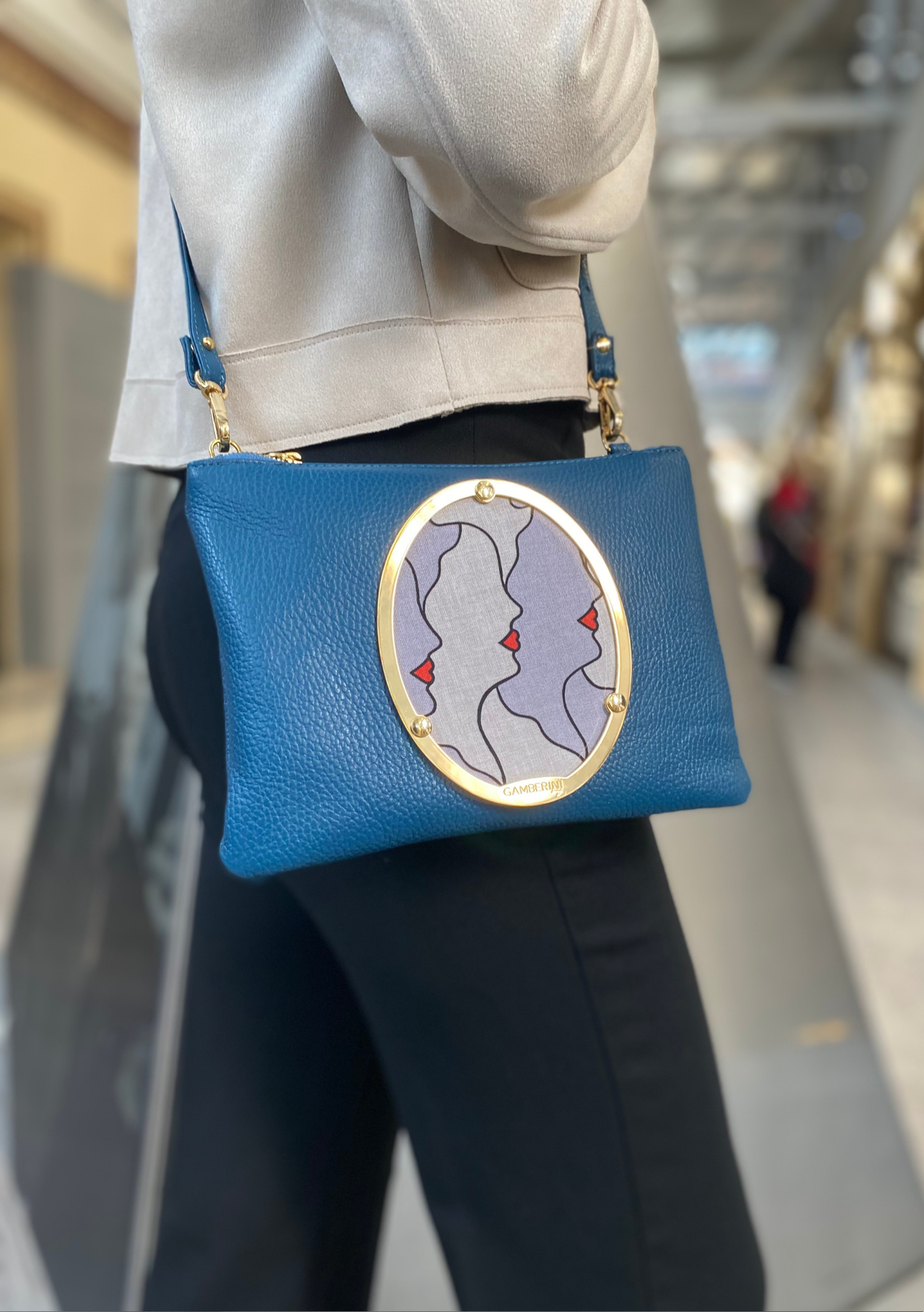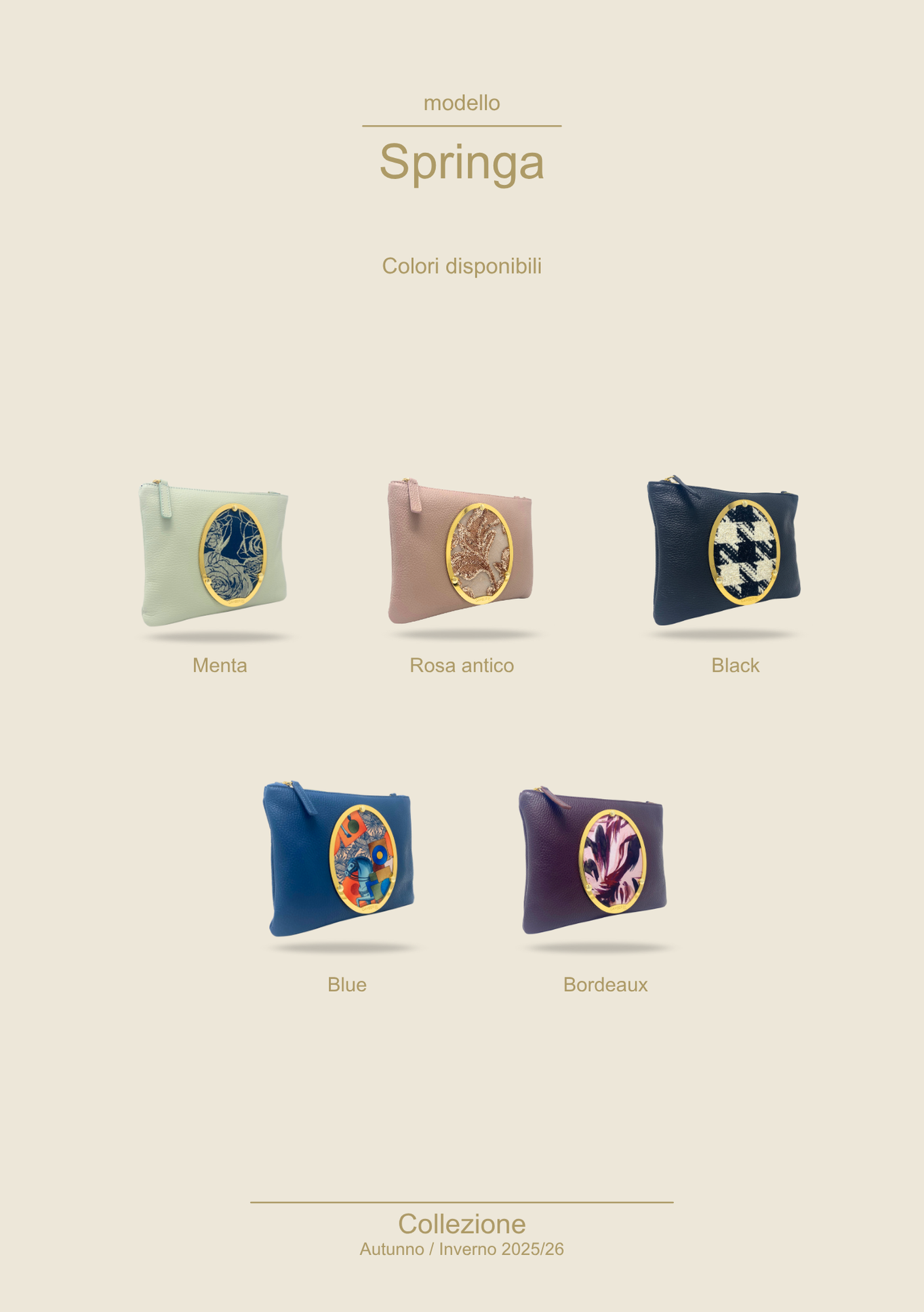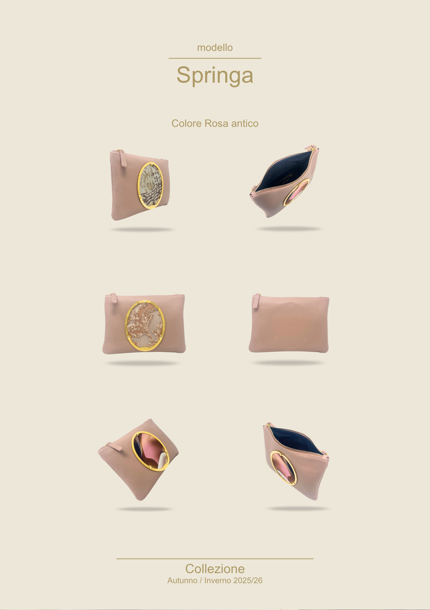 Sul fronte domina l’elemento iconico: un grande cameo ovale incorniciato in metallo dorato. Non è solo un dettaglio decorativo, ma una piccola opera d’arte da indossare, che rende Springa immediatamente riconoscibile. La tracolla regolabile in pelle, con moschettoni dorati, permette di portarla comodamente a spalla o crossbody, lasciandoti le mani libere. Il formato è studiato per contenere tutto ciò che serve in modo ordinato: portafoglio, smartphone, chiavi, piccoli oggetti personali.