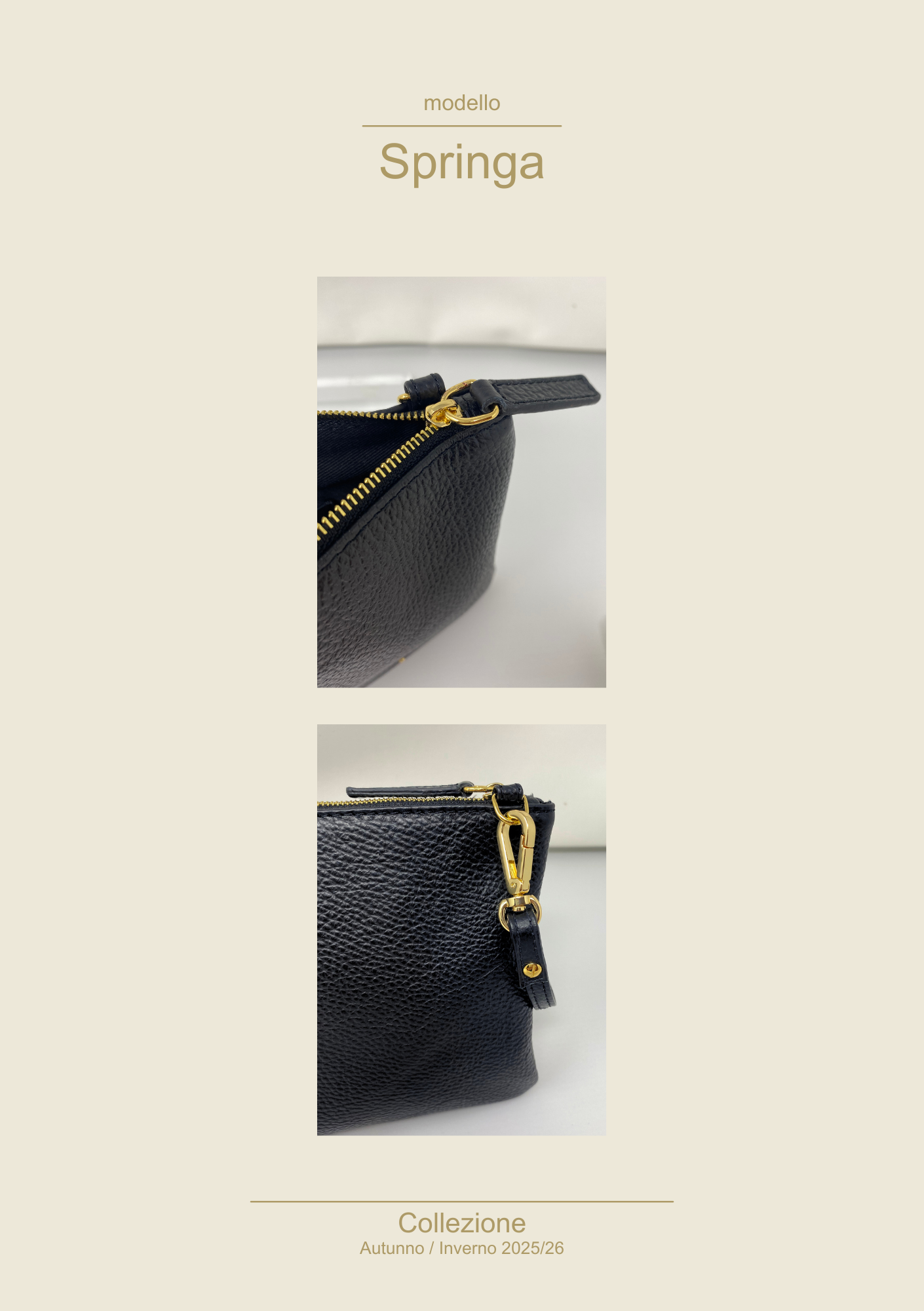Springa è la borsa a tracolla pensata per chi vuole portare con sé l’essenziale senza rinunciare all'eleganza. Compatta e piena di personalità, si muove con te tra lavoro, appuntamenti e serate in città, diventando subito il punto focale di ogni look.