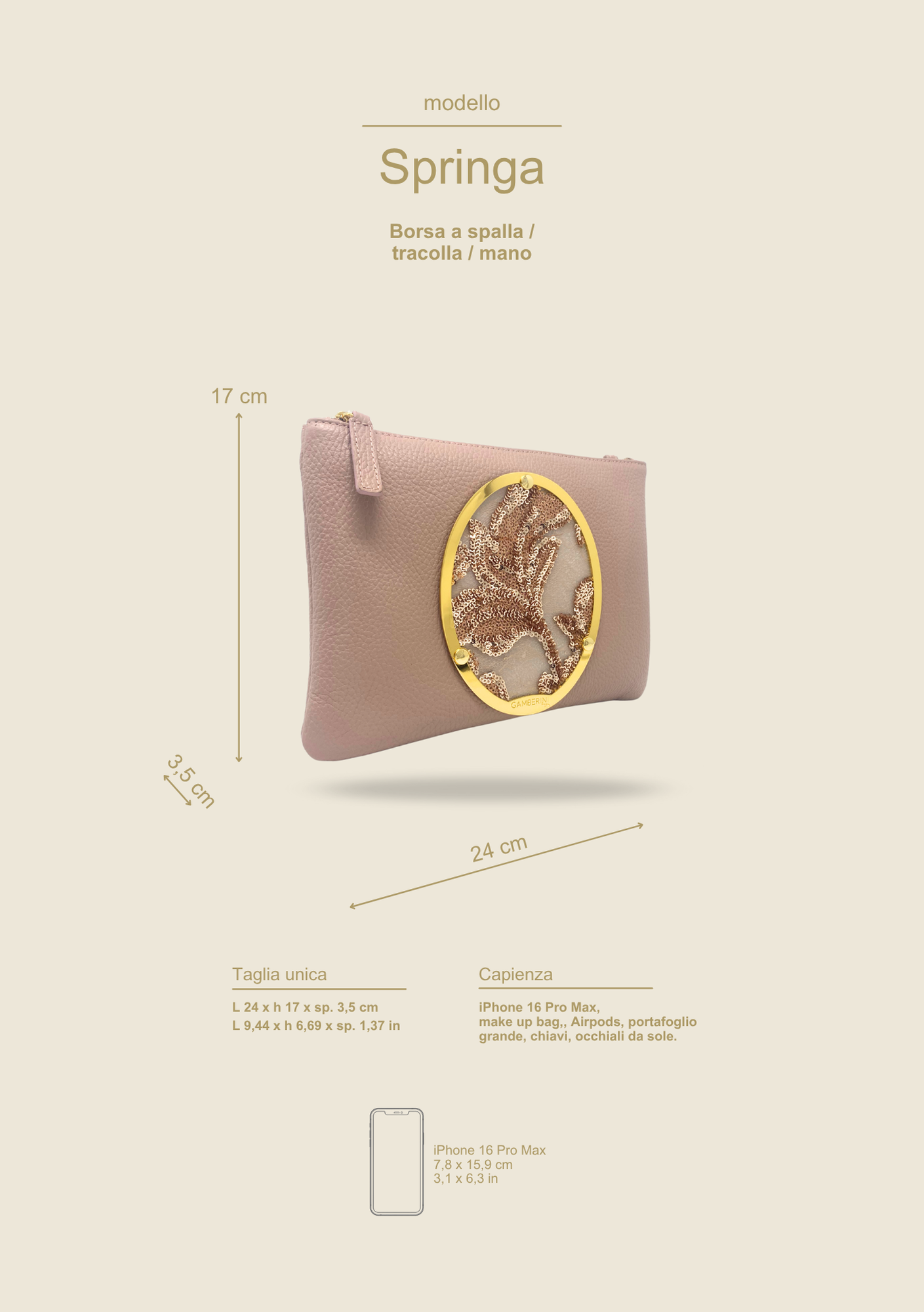 - Tracolla: regolabile in pelle, con moschettoni in metallo dorato